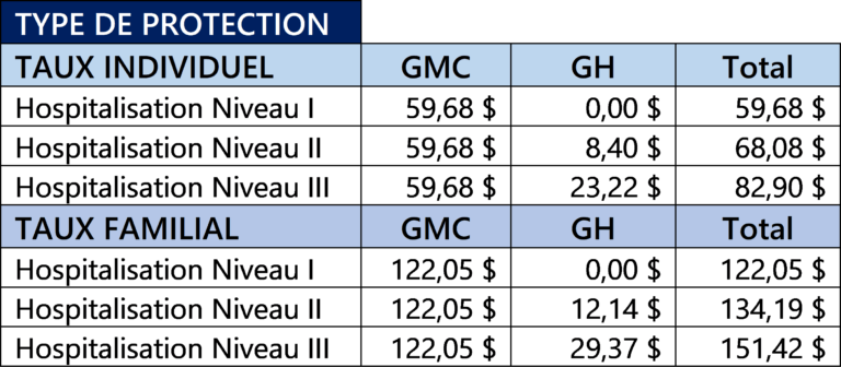 Les tableaux suivants détaillent les taux de cotisation pour la Garantie-maladie complémentaire (GMC) et la Garantie-hospitalisation (GH) ainsi que le montant total payé chaque mois par le membre retraité.